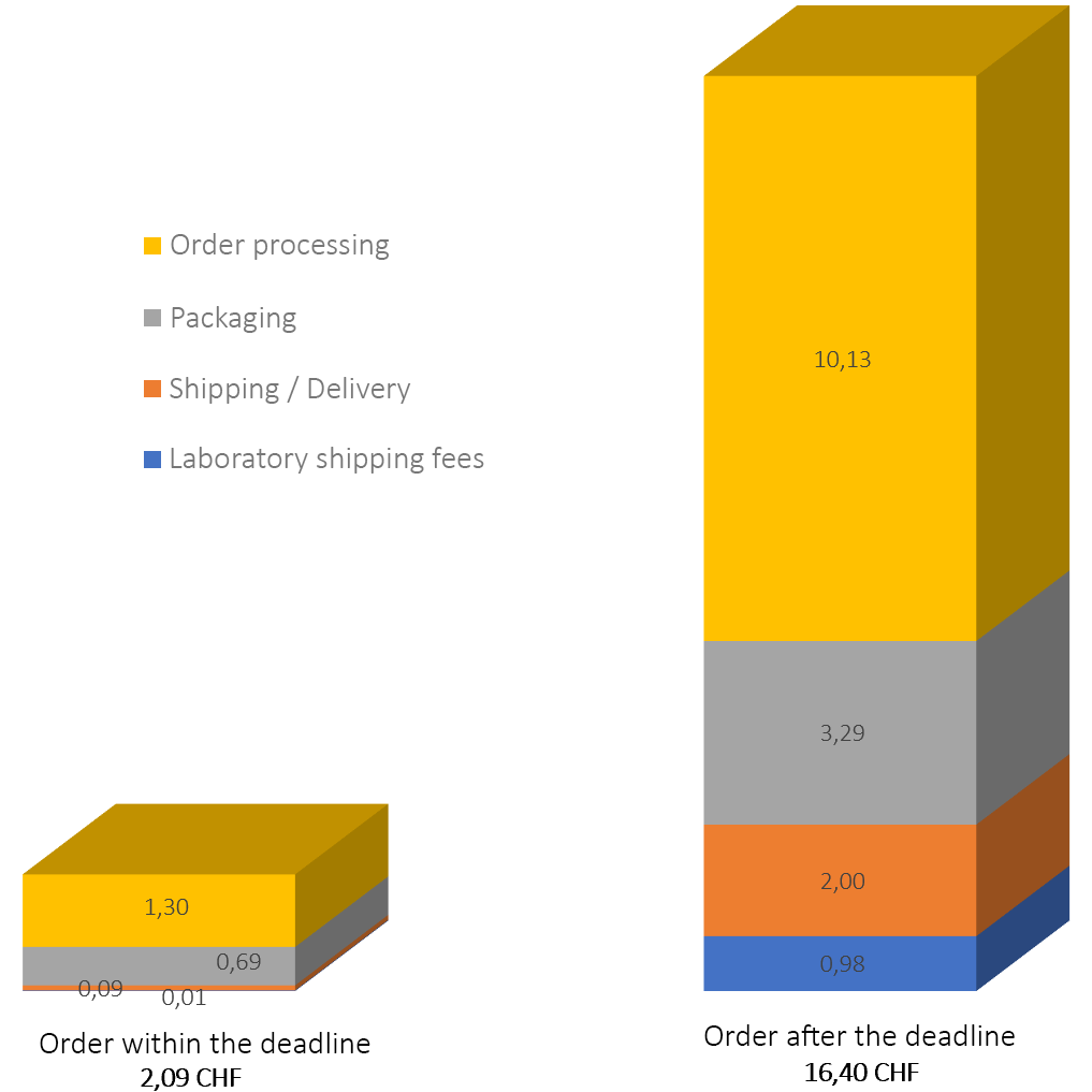 Here is an illustration of the costs incurred for an order: distribution and cost comparison. Only the processing costs for orders placed after the deadlines are billed.